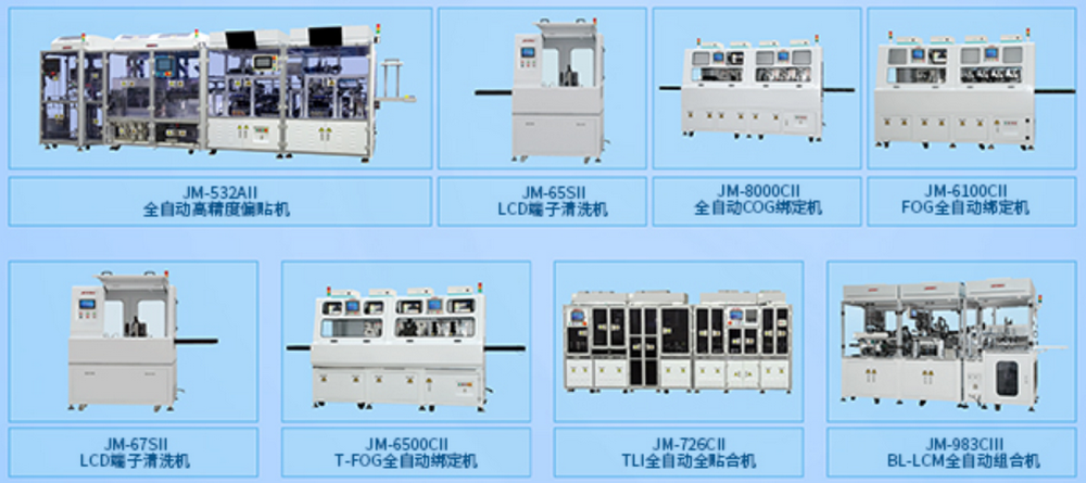 公司的主要產(chǎn)品包括有:COG全自動(dòng)綁定機(jī)、FOG全自動(dòng)綁定機(jī)、T-FOG全自動(dòng)綁定機(jī)、TLI全自動(dòng)全貼合機(jī)、BL-LCM全自動(dòng)組裝機(jī)、背光源全自動(dòng)疊片機(jī)、CCM全自動(dòng)綁定機(jī)、3D貼膜機(jī)、脈沖式熱壓機(jī)等系列設(shè)備。