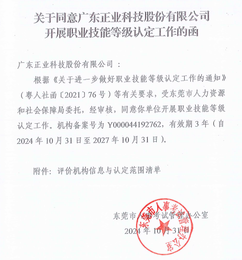 近日,廣東正業(yè)科技股份有限公司(以下簡稱:正業(yè)科技)收到了東莞市人事考試管理辦公室“關(guān)于同意廣東正業(yè)科技股份有限公司開展職業(yè)技能等級認定工作的函”。這標志著公司順利完成了職業(yè)技能等級認定備案工作,開啟了公司技能人才隊伍培養(yǎng)與認定的新篇章。